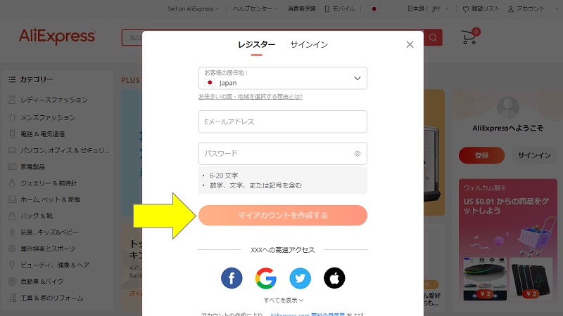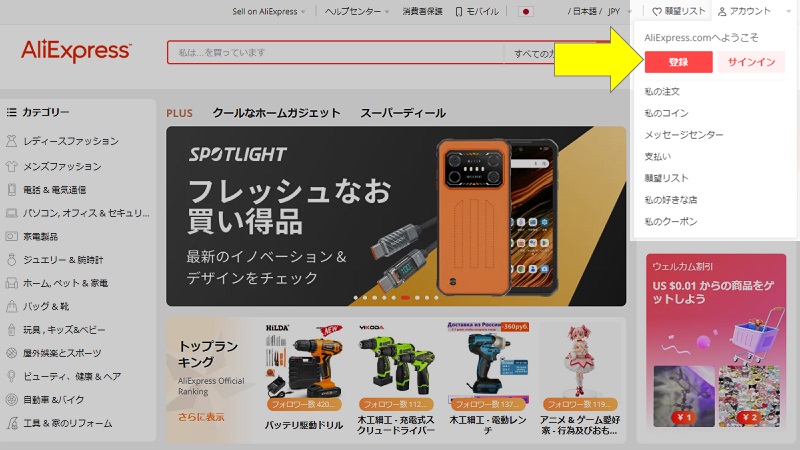 AliExpressトップページの右上「アカウント」メニューから「登録」をクリックします。