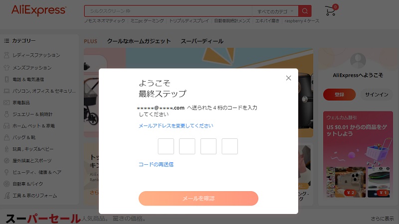 入力したメールアドレス宛にAliExpressからメールが届きます。
